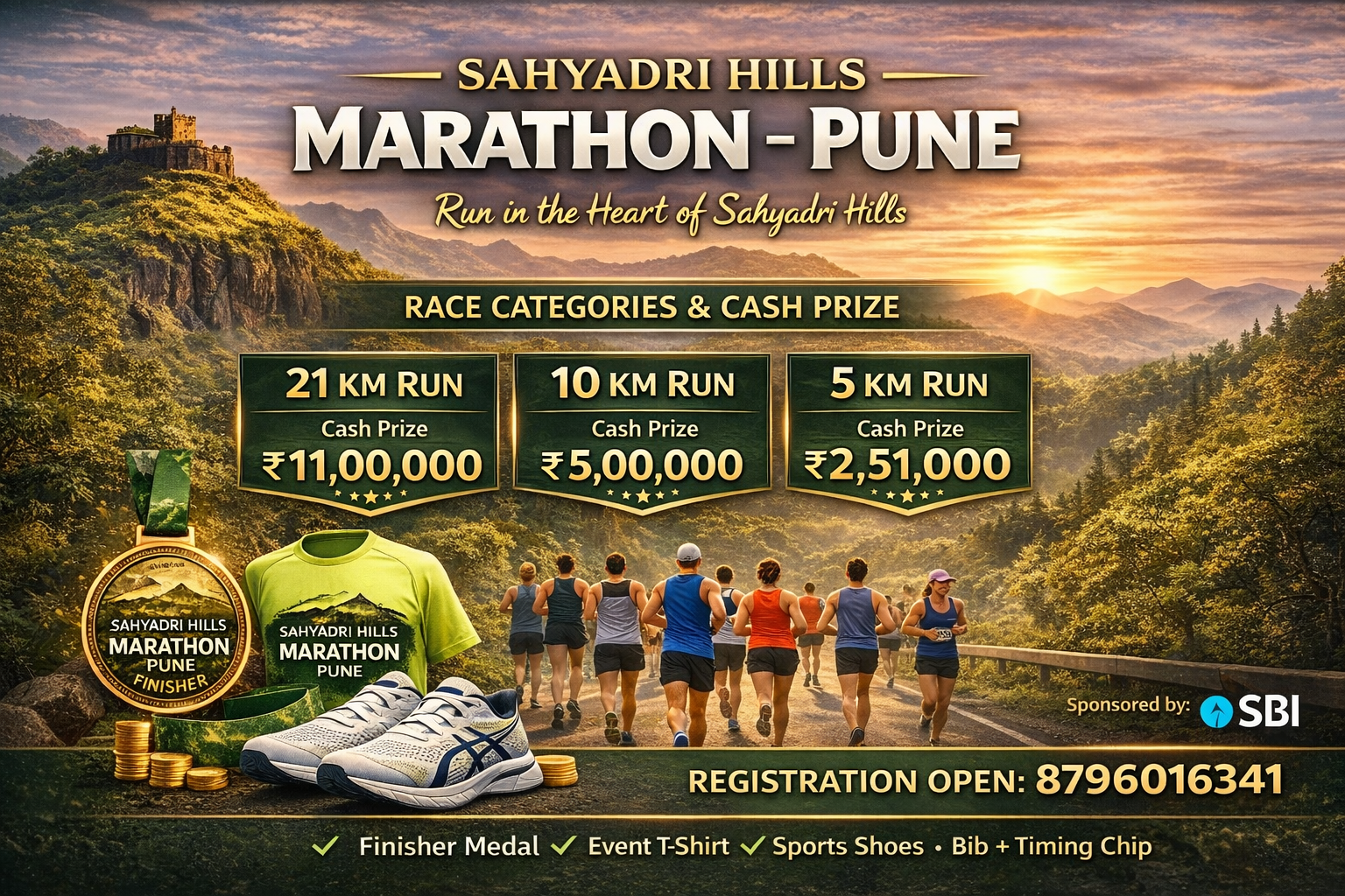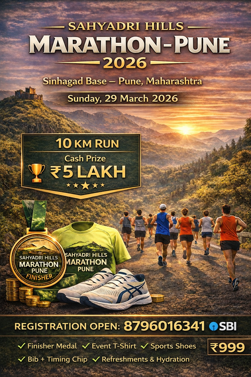 Sahyadri Hills Marathon – Pune 2026 ek premium running event hai jo Sahyadri Hills ke scenic routes par organize kiya ja raha hai. Event ka start point Sinhagad Base – Pune, Maharashtra hoga jahan runners ko beautiful hill views aur fresh morning atmosphere ke saath running ka unique experience milega.
